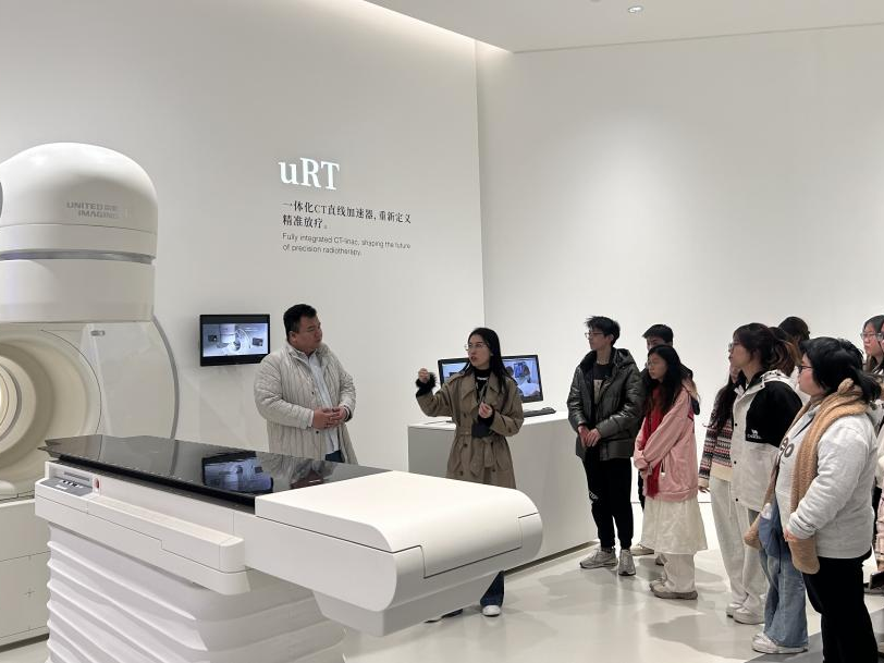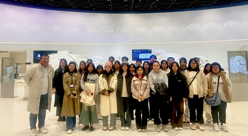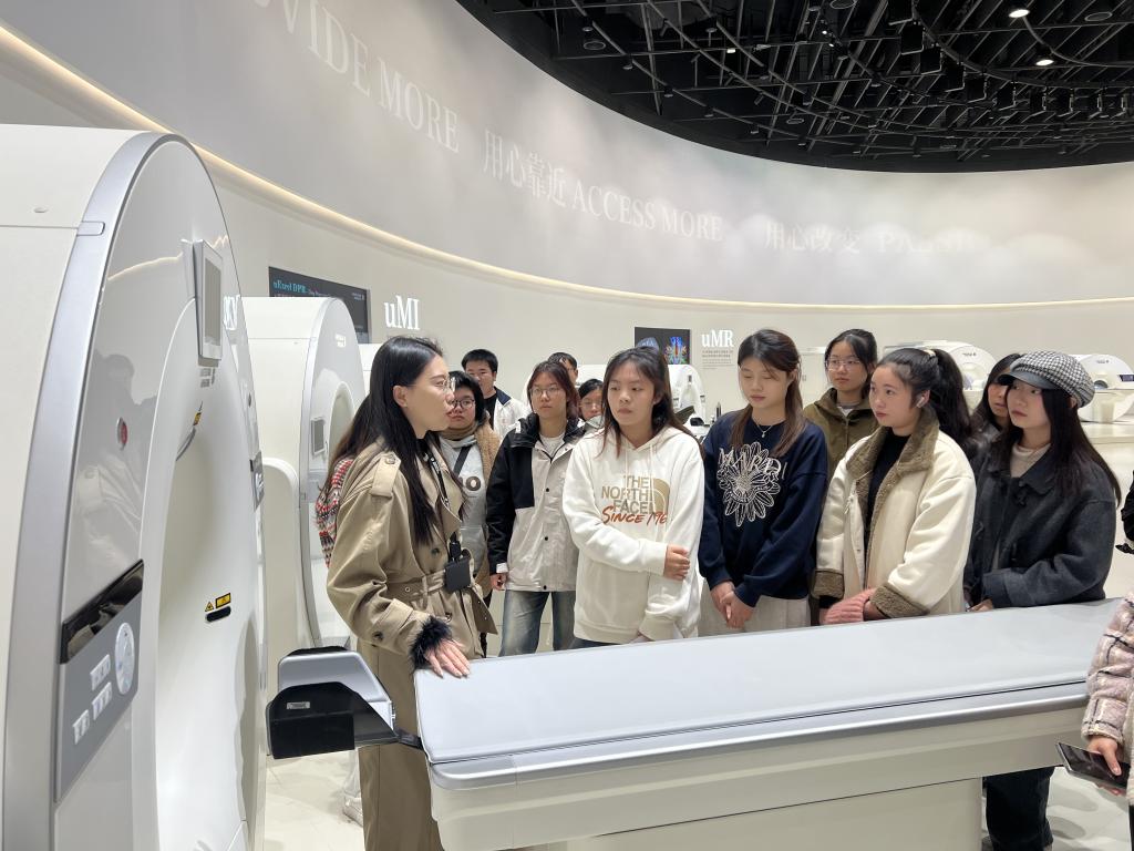 在我校2014级校友,联影医疗(武汉)总裁助理邓梦菲的带领下,学生们参观了联影医疗展厅,展厅汇聚了生命科学仪器、医学影像与放疗全线产品。邓梦菲介绍到,联影集团医疗产品已进驻美国等70多个国家和地区,服务超13700家医疗机构,亦入驻全国1000多家三甲医院。