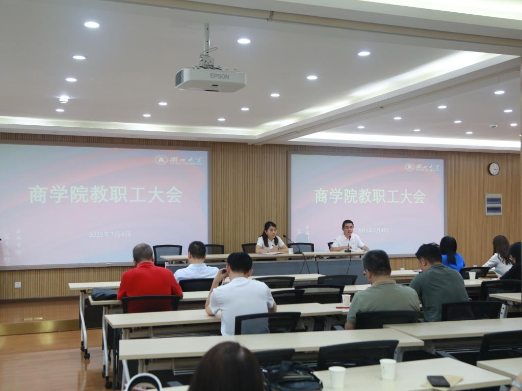 7月4日下午,商学院在逸夫楼C2014报告厅召开全体教职工大会。会议由党委书记何肖主持。