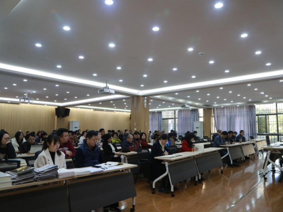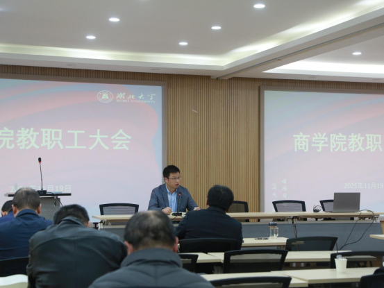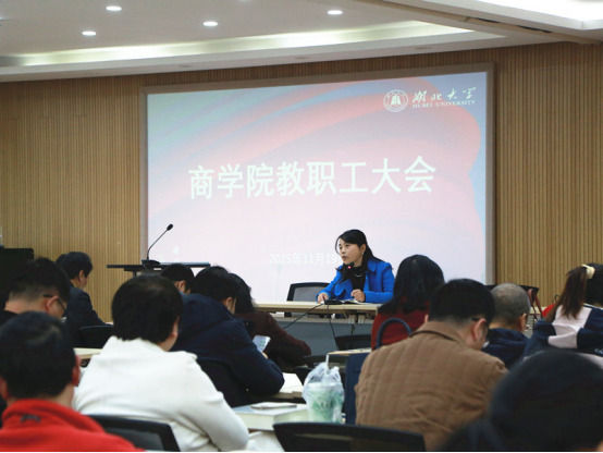 11月19日下午,商学院在逸夫楼C2014报告厅召开全院教职工大会。会议由院党委书记何肖主持。
